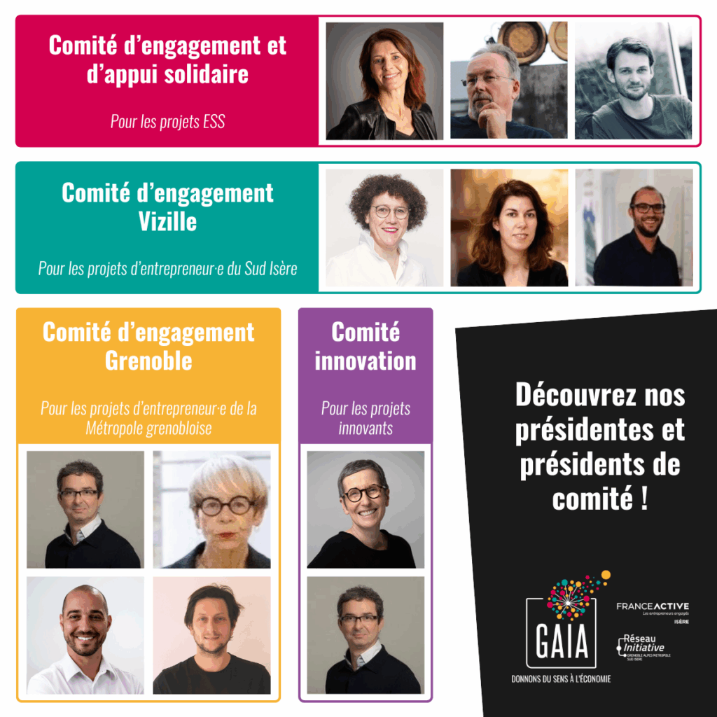 Les comités d’engagement de GAIA sont composés de personnes bénévoles, expertes de leur domaine (juristes, experts comptables, chefs d’entreprises, banquiers, etc.). Ils se réunissent chaque semaine pour accueillir, analyser, questionner les entrepreneurs et leurs projets et décider de l’octroi des financements et accompagnements sollicités.