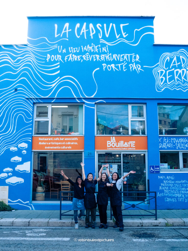 Lors de son exploration de l’écosystème alimentation associative à Grenoble, Elodie a rencontré par différents biais Estelle, Justine et Lucie. Voyant le potentiel de La Capsule, et de ces personnes aux expériences diverses et complémentaires, ayant les mêmes valeurs écologiques et sociales, le même amour de la cuisine, et la même envie d’ouvrir un lieu convivial autour de l’alimentation, Elodie nous a mises autour d’une table en février 2025 pour observer la dynamique de groupe, la compatibilité ou non de nos envies et besoins. Incroyablement très compatibles, nous nous sommes présentées en groupe avec notre ébauche de projet à Cap Berriat dès fin février. C’est en mars que Cap Berriat nous a confirmé nous faire confiance pour reprendre l’espace test café, bar et restaurant au sein de La Capsule.